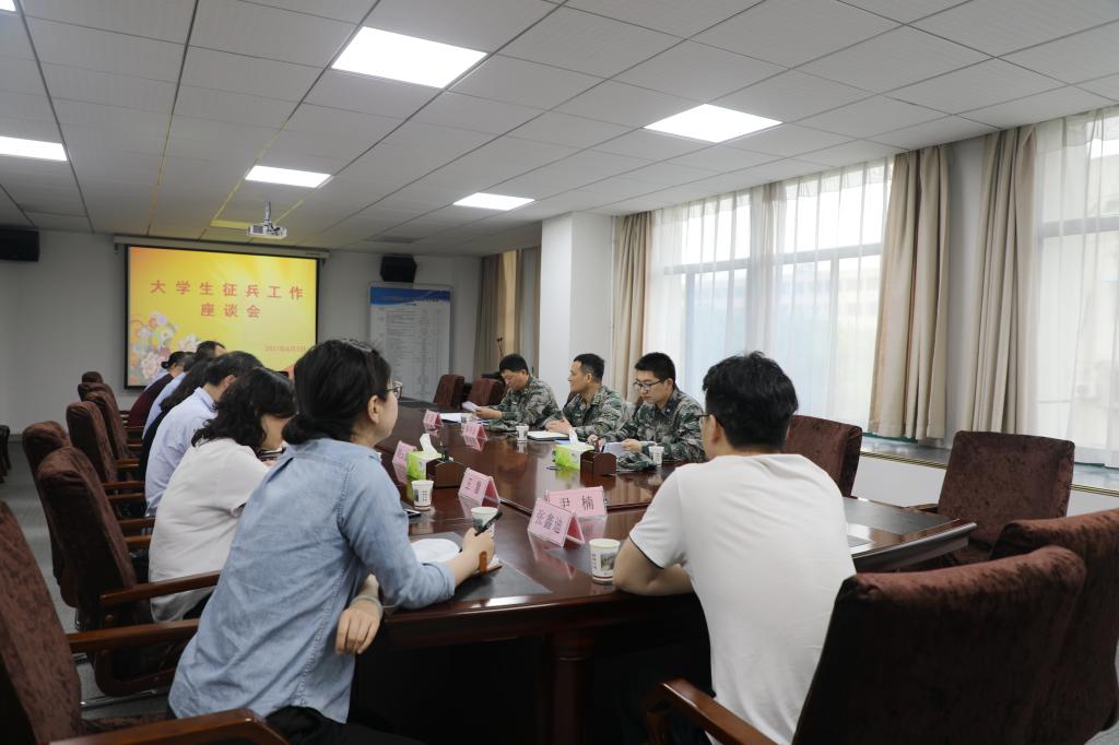 6月3日下午,学校在行政办公楼308会议室召开2021年大学生征兵工作座谈会。淮南市军分区动员处参谋彭磊、大通区武装部政委秦传金、我校学生部副部长程婕、各学院毕业班辅导员代表及校武装部相关人员参加了座谈。会议由校综合办公室主任马军主持。