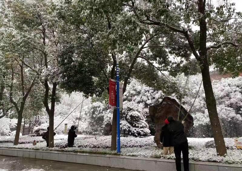 经过两个多小时的紧张奋战,低垂的树枝昂起了头,湿滑的路面干净整洁,洁白的校园又恢复了往日的景观。(撰稿:刘善连 审核:万丽萍 发布:戴文涛)