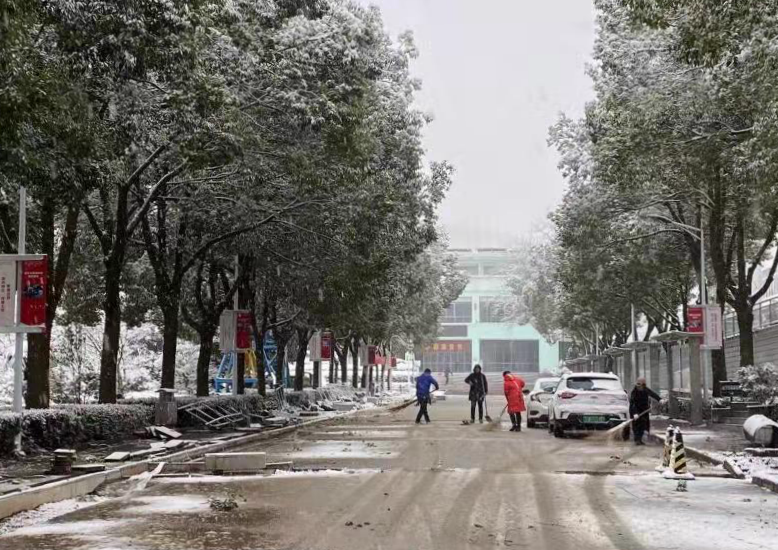 大家冒着飞舞的雪花,齐心协力清除树木和道路积雪,头发湿了、鞋子潮了、脸冻红了,没有一个人叫苦喊累,寒冷的冬天里散发着火热的干劲,为师生清扫出“暖心通道”,给这个寒冷的季节添加了一份温暖。