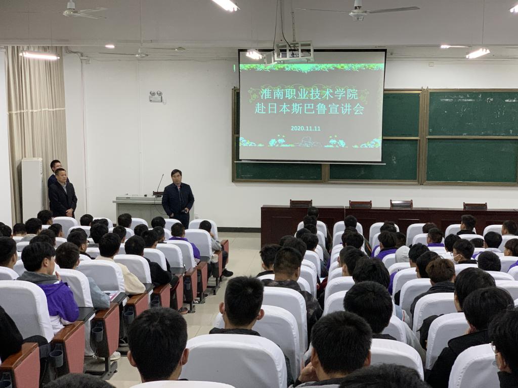2020年11月11日晚,在学校中区1111报告厅,芜湖市外经服务有限公司经理、日本“斯巴鲁”海外实习项目业务总监周峰,项目经理阮永应邀来校做赴日本斯巴鲁公司海外实习项目宣讲会。机电工程学院160多名师生参加宣讲会。学校招生就业办主任胡道成主持会议。