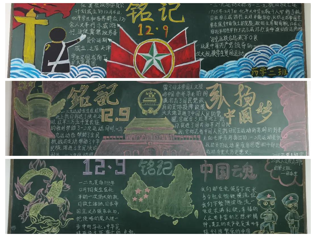 在以纪念“一二·九”运动为主题的黑板报评比活动中,各学院团总支、班级团支部认真组织团员搜集资料,深入了解“一二·九”运动爆发的历史背景,带领同学们积极创作,呈现出一块块丰富多彩、图文并茂的板报。板报详细介绍了“一二·九”爱国运动发生的时代背景以及学生爱国、护国运动的细节。鲜艳的粉笔书写出一首首激情澎湃的诗歌,勾画出一幅幅精美的画面。