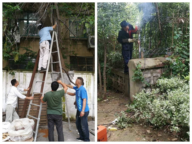 针对学校部分围墙开裂、系部楼南围墙处铁艺栅栏锈蚀破损、树木倾斜等安全隐患,总务处本着节约每一分钱理念从技师学院调废弃的钢管,对围墙和倾斜树木进行修复、加固、支撑;用之前栅栏的边角料通过焊接修复损坏铁艺栅栏。