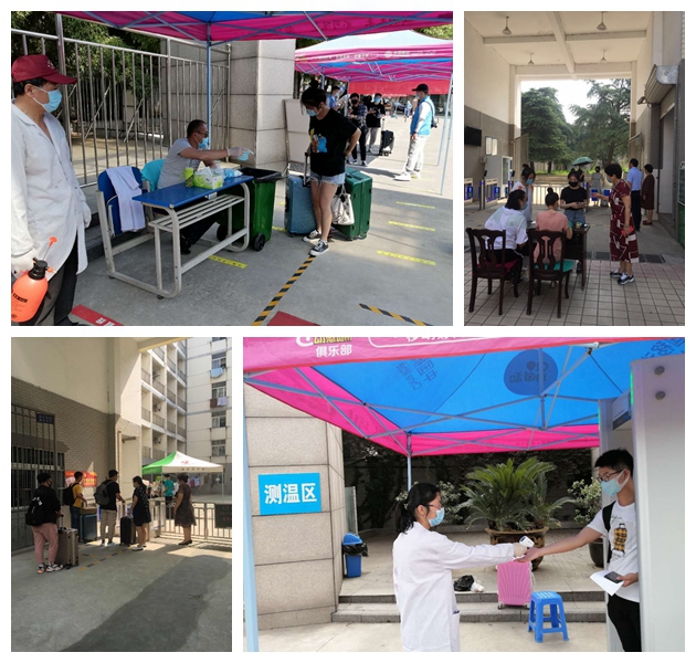 爱心迎接 在返校第一站的“校门口”,总务处工作人员向进校学生发放口罩,对随身的行李箱使用医用酒精进行消杀,给远道而来的学生提供解暑绿豆汤,用“爱”迎接回家的学子,笑意在同学们的眼角洋溢。