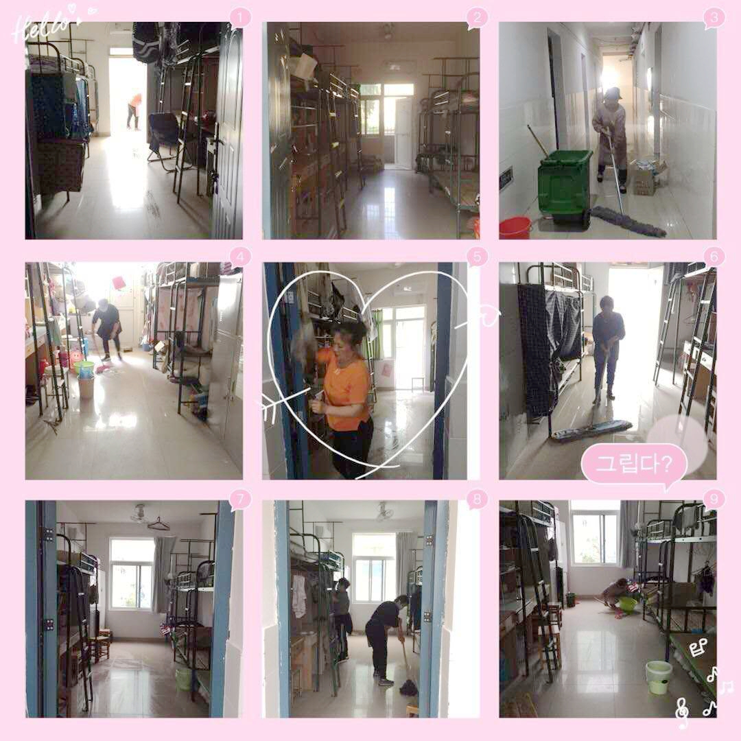 暖心宿舍 为了给学生营造良好的住宿环境,确保广大学子返校后住得舒心安心,学生公寓宿管员连续20多天反复对全校学生寝室进校清洁、消毒和通风。宿管员为同学们整理床铺物品、晾晒被褥、清洁宿舍环境。宿舍整理工作繁琐,时常需要爬上爬下,加之近期气温升高、面带口罩,她们往往气喘吁吁一身汗。但想到能换来久别重逢的同学们拎包入住、暖心一笑,大家都表示苦点、累点也值了。