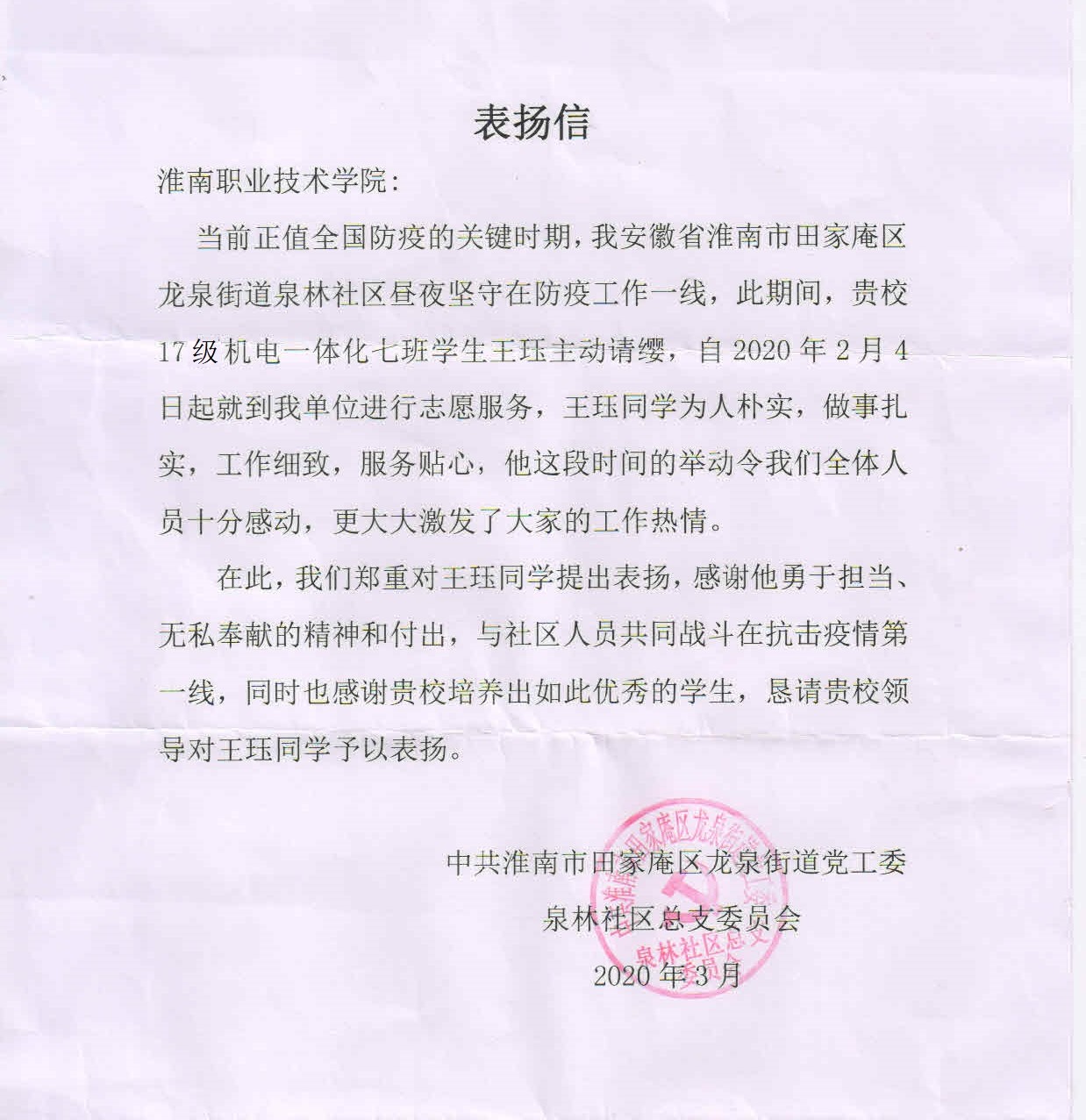 我校机电工程系2017级机电一体化专业7班学生王珏、孔进在疫情防控期间,主动报名社区志愿服务,配合社区疫情防控工作人员做好卡点执勤、查验出入人员、宣传防疫知识、人员体温监测等工作。他们在志愿者服务岗位上不怕苦不怕累,踏实做事,贴心服务。中共淮南市田家庵区龙泉街道党工委对他们在疫情期间的表现给予高度评价,并专门写信表扬他们的志愿行为。