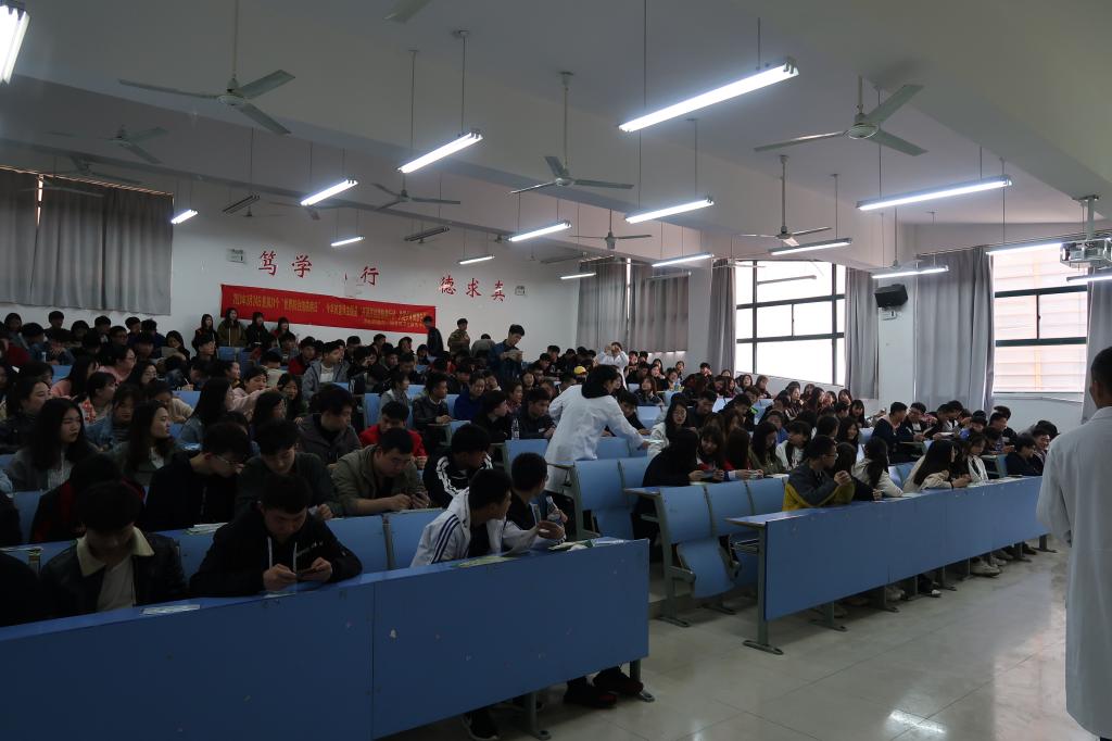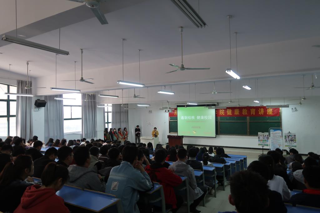 3月20日下午,后勤集团特邀淮南市洞山社区卫生服务中心主治医师丁军芳一行来校,联合举办了一场结核病及艾滋病防治知识健康教育讲座。校专职防疫人员向学生讲解了结核病、艾滋病、结核杆菌、艾滋病毒、结核病的常见症状、传染源、传播途径、高危人群、预防等知识,并组织学生观看了结核病、艾滋病宣传视频。讲座现场洞山社区卫生服务中心专业人员与同学们互动,开展了生动有趣的有奖答题活动,学生们积极参与,争相抢答,取得了良好的效果。“爱健康”社团学生志愿者佩戴红绶带,共发放宣传资料300余份。