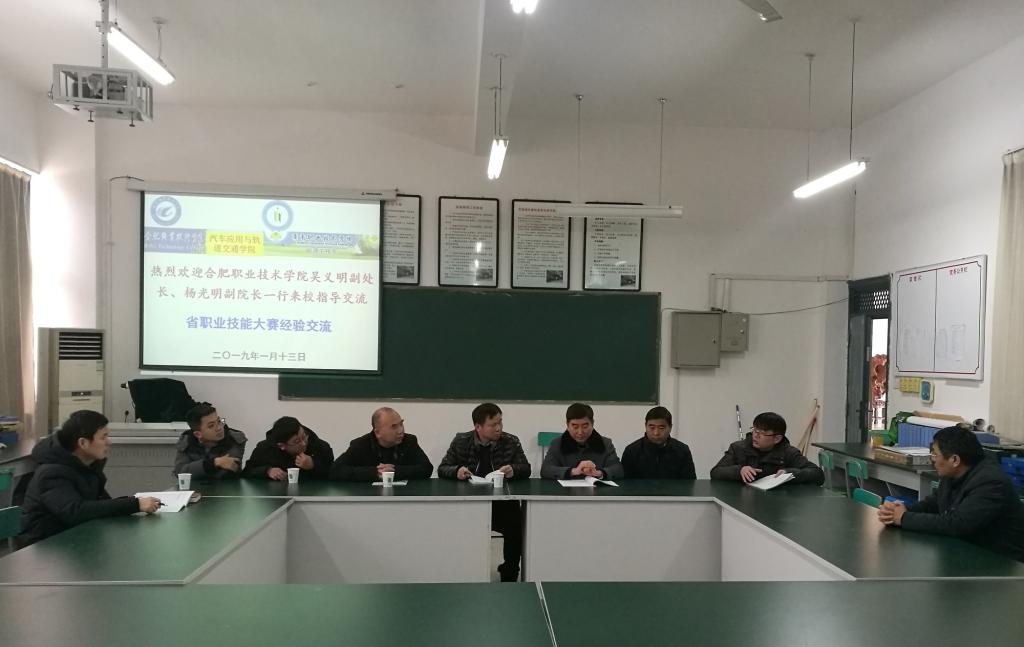 为加强省职业技能大赛比赛经验交流,2019年1月13日,合肥职业技术学院教务处副处长吴义明、汽车应用与轨道交通学院副院长杨光明等一行四人来校指导交流。教务处处长胡道成热情接待来宾,能源工程系系领导、赛项负责人和指导老师参加座谈交流。