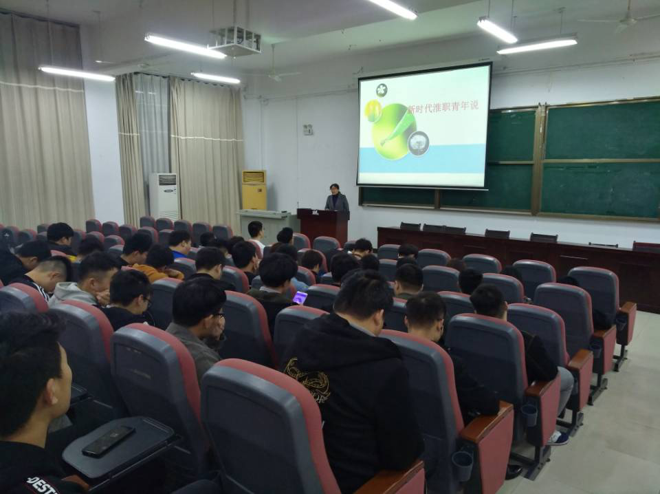 为深入学习贯彻习近平在2018年全国教育工作大会上的讲话精神,坚持不懈以社会主义核心价值观教育引领新时代新青年,不断提高我校大学生思想道德素质,坚定共产主义远大理想和中国特色社会主义共同理想,由学校党委工作部、学生处和思政部联合举办的“新时代淮职青年说”系列讲座第二讲,于11月28日晚在一号教学楼1111教室开讲。这次讲座,由思政部优秀骨干教师宋岩老师主讲,她主讲的题目是“追求远大理想,坚定崇高信念”。信电系、机电系和能源系2018级新生共200余名学生到场聆听此次讲座。