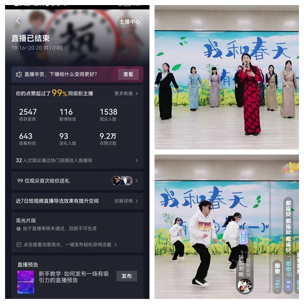 为丰富特殊时期的大学生校园文化生活,3月25日晚,校团委组织举办了以“我和春天有个约会”为主题的文艺晚会。根据疫情防控相关要求,此次晚会以抖音线上直播的形式进行,同学们在宿舍利用周末时间在抖音平台上观看晚会,根据抖音直播数据显示本次直播共计3650人次在线观看了晚会精彩盛况,获赞9.2万余次。