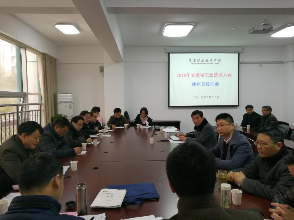 2018年3月20日,安徽省2018年高职院校技能大赛(高职组)“数字化矿山监测技术”裁判员培训会在淮南职业技术学校行政办公楼二楼会议室召开。学校邀请淮南矿业集团有关技术人员组成大赛裁判组。裁判员、参赛学校指导老师参加会议。