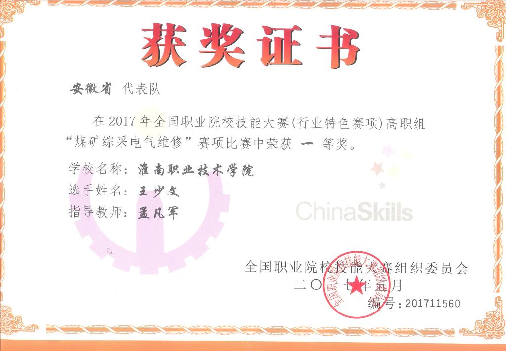 2017年全国职业院校技能大赛(行业特色赛项)高职组“煤矿综采电气维修”赛项比赛2个一等奖