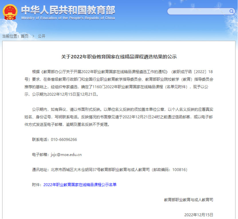 近日,教育部发布《关于2022年职业教育国家在线精品课程遴选结果的公示》,这是职业教育首次独立认定国家在线精品课程,确定了1160门2022年职业教育国家在线精品课程,我校《工程爆破技术》课程成功入选,实现学校国家级精品课程零的突破。
