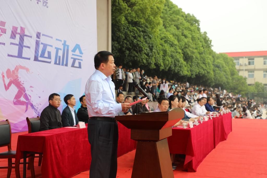 吴新社指出本届运动会是我校贯彻“全面育人”教育方针的重要载体,是对全体师生身体素质、竞技水平、团队意识和精神风貌的检阅;是我校为建党100周年、庆祝建校70周年献礼的一次盛会。吴新社对本次大赛提出几点希望,希望全体运动员发扬以爱国主义、集体主义、拼搏向上为核心的中华体育精神,亮出风采,赛出水平;希望全体裁判员和工作人员秉公执法、恪尽职守,优质高效地完成比赛的各项工作;希望各代表队相互学习、加强交流,取得比赛成绩和道德风尚双丰收;希望师生不畏困难,顽强拼搏,奋勇争先,以坚韧执着和稳健矫捷,书写青春的风采,创造赛场的奇迹,把本届运动会办成一场“团结奋进、文明进取、勇攀高峰”的盛会。