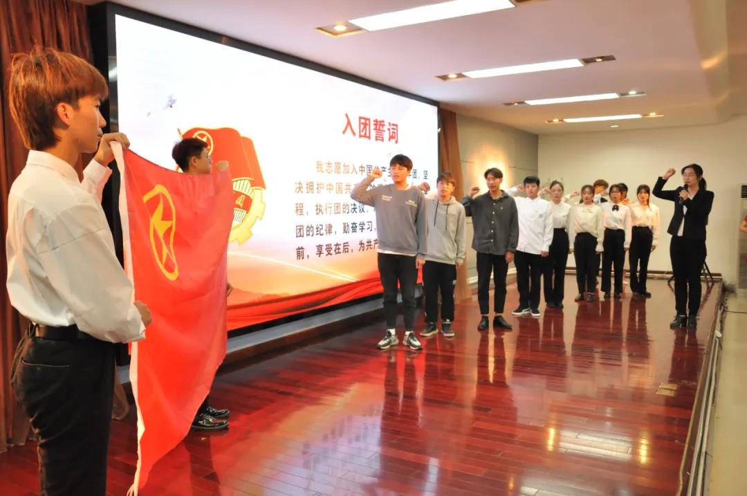 随后进行的是新团员入团仪式暨老团员重温入团誓词,全体人员面向团旗,庄严宣誓,高亢嘹亮的宣誓彰显着淮职青年的青春力量。