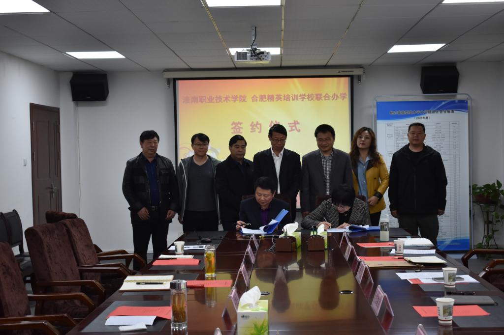 4月13日下午,淮南职业技术学院与合肥精英培训学校合作办学签约仪式在洞山校区行政楼三楼会议室举行。淮南职业技术学院党委书记、校长吴新社,副校长王德恩、胡道成,合肥精英培训学校校长费然,集团顾问古继宝,校长助理熊晶远共同出席签约仪式。