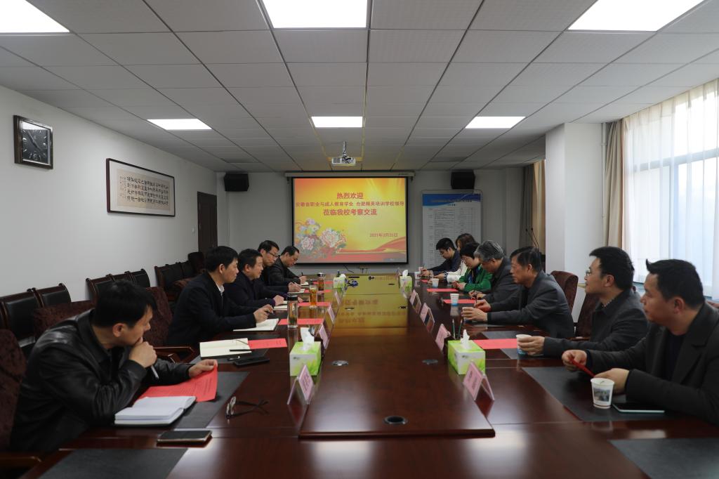 3月25日下午,安徽省职业与成人教育学会会长李兴旺、常务副会长兼秘书长孙中义,合肥精英培训学校校长费然一行7人来校考察交流。党委书记、校长吴新社亲切会见来宾,并与客人进行座谈交流。副校长凌总成、王德恩陪同会见。