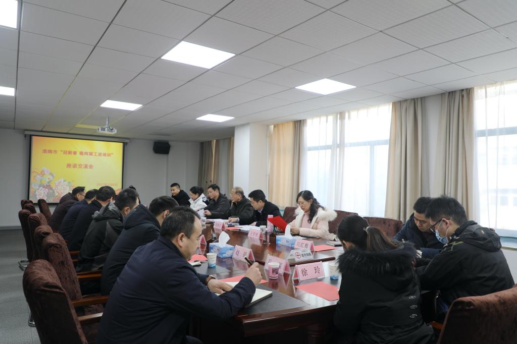 2月8日下午,淮南市“迎新春 稳岗留工送培训”座谈交流会在我校召开。市人社局三级调研员徐曰诠,市职业能力建设科副科长周炳吉,高新区、经开区人社局及辖区内企业代表,校党委副书记、纪委书记、工会主席张友超,校长助理、技师学院直属党支部书记王德恩参加会议。