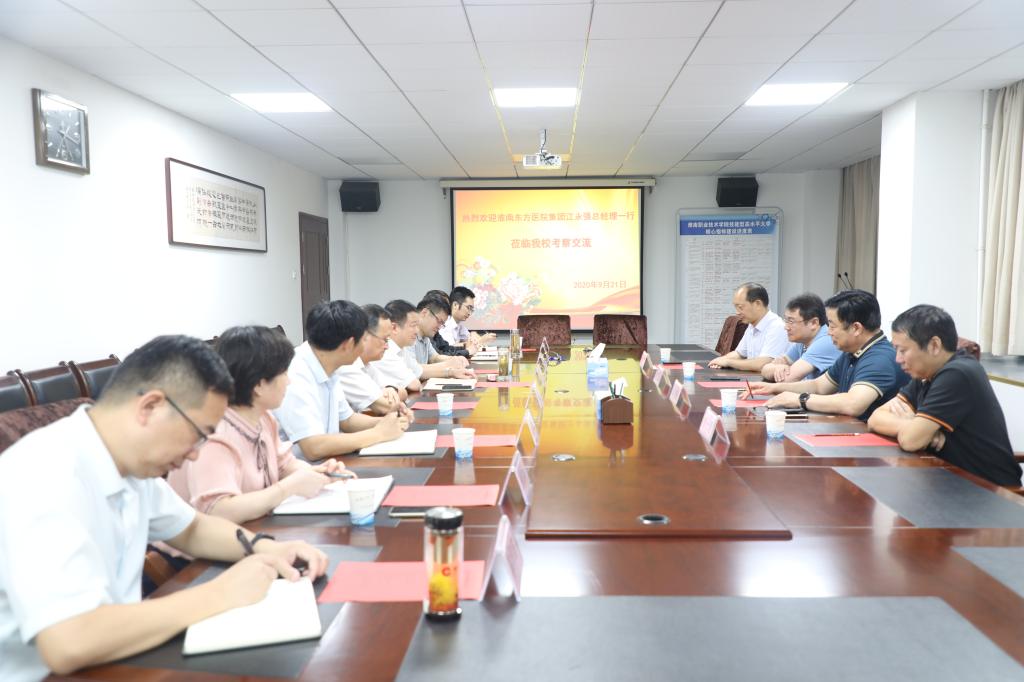 吴新社首先代表学校对江永强一行来校考察交流表示热烈欢迎,对淮南东方医院集团多年来支持我校医学院建设发展表示衷心感谢。他从学校的发展定位、学科专业、师资队伍、人才培养、招生就业等方面介绍了学校发展情况,希望双方以此次来访为契机,加强交流与合作,实现共同发展。江永强感谢学校的热情接待,介绍了淮南东方医院集团十余年的发展历程、下一步的发展战略及人才需求情况。双方就进一步加强合作进行深入交流。