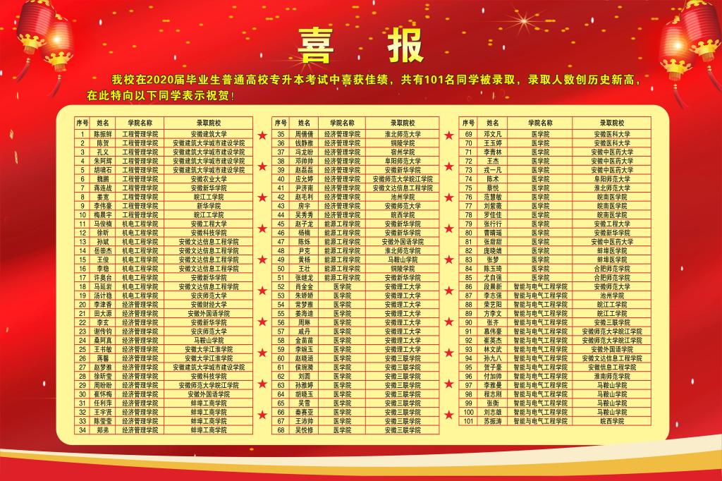 莘莘学子三年磨砺,辛勤耕耘终结硕果。近日,2020年安徽省普通高校专升本考试录取工作落下帷幕,我校2020届毕业生专升本成绩斐然,共有101名同学被本科院校录取,录取人数和录取率均创历史新高。