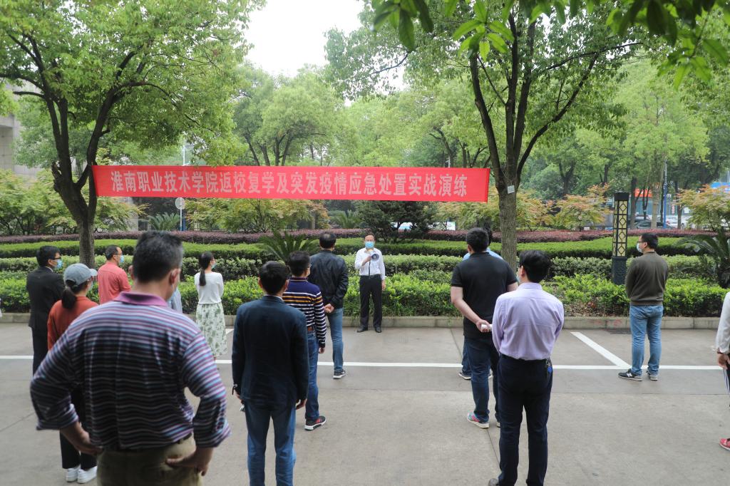 为进一步贯彻落实安徽省教育厅关于春季学期返校复学工作要求,扎实做好学生返校复学疫情防控工作,切实提高突发情况应急处理能力,保障返校复学后各项工作平稳安全有序,5月8日上午,根据《淮南职业技术学院疫情防控期间学校开学应急演练方案》安排,我校举行了2020年春季学生返校复学及突发疫情应急处置实战演练。