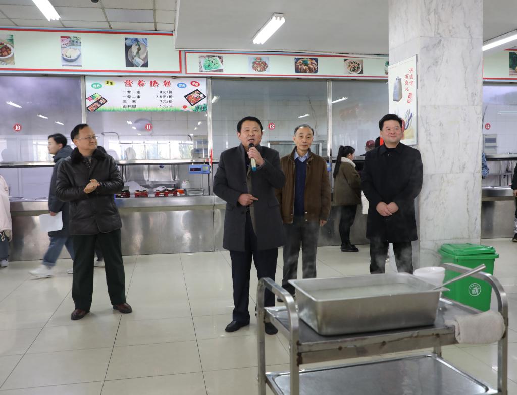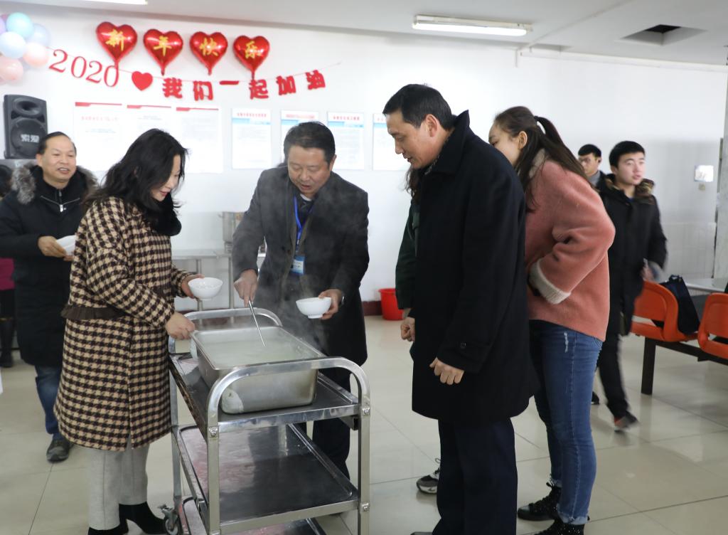 12月31日中午,正是用餐时间,学校食堂二楼播放着喜庆的乐曲,学生教师济济一堂,热气腾腾的饭菜映衬着师生满是笑意的脸庞。学校领导班子为全校教职工和学生送来节日的慰问和祝福,并为师生员工亲手乘上一碗碗寓意着美满和幸福的汤圆。