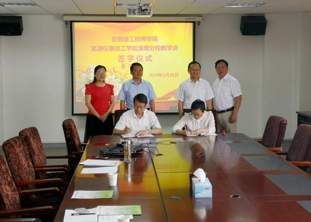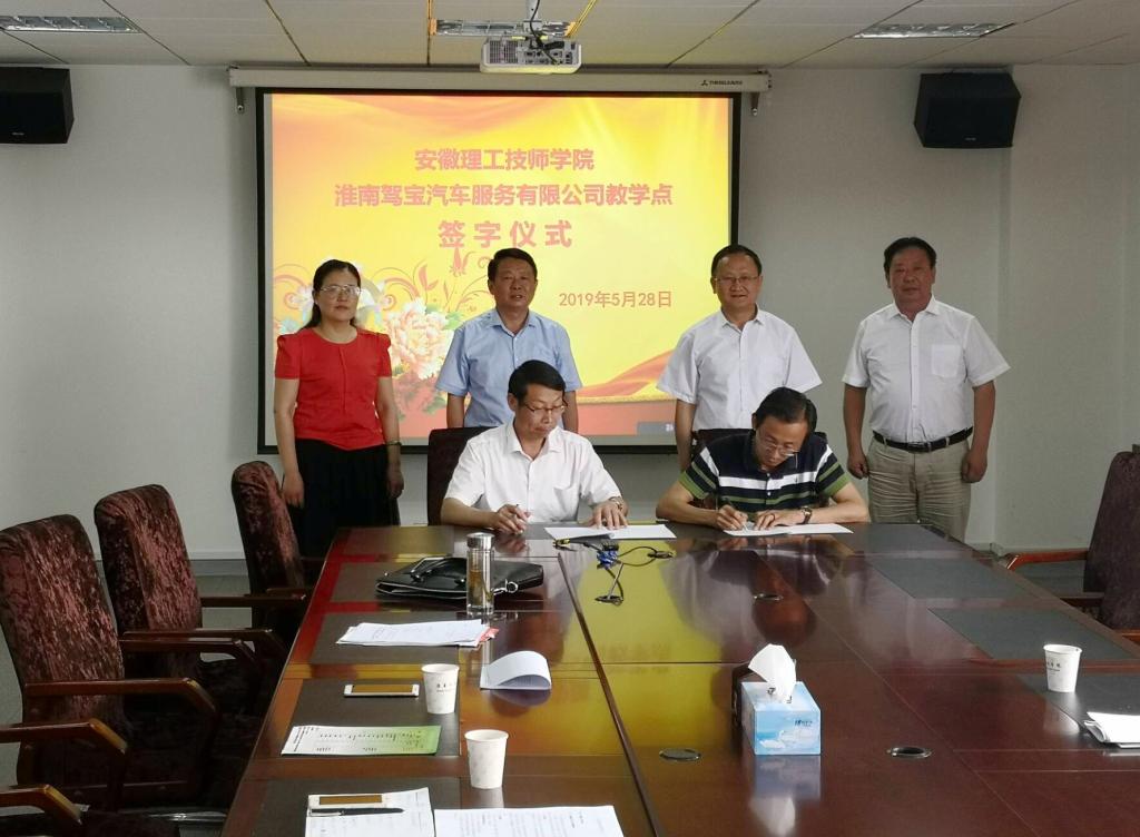 5月28日上午,安徽理工技师学院芜湖仪表技工学校淮南分校教学点、安徽理工技师学院淮南驾宝汽车服务有限公司教学点成立签约仪式在学院三楼会议室举行。学校党委书记、董事长吴新社,党委副书记、纪委书记、工会主席张友超及技师学院相关人员出席了签约仪式。
