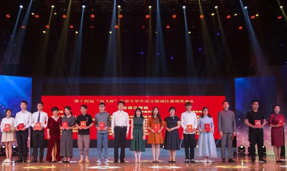 “讯飞杯”全省大学生诗文朗诵比赛自2006年开办以来,以其赛事规格高、选手水平高的特点,代表了我省大学生朗诵活动的一流水平,2016年起被安徽省教育厅纳入安徽省大学生学科和技能竞赛部分B类项目,已成为我省大学生校园文化生活的经典活动。我校已连续四年同安徽大学、安徽师范大学等院校同台竞技,晋级决赛,并取得优异成绩。(撰稿:程婕 摄影:李丹丹 审核:常为来 审定发布:戴文涛)