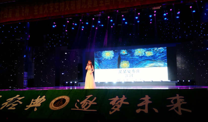接到比赛通知后,团委认真遴选选手,精心选择朗诵作品参加比赛。从作品感情的把握、肢体语言的表达和朗诵的技巧等方面对参赛选手进行细致地培训。决赛中,丁雪同学面对众多播音主持专业的选手毫不怯场,对作品的精彩演绎赢得了评委和现场观众的一致好评,充分展现了我校学子朝气蓬勃、积极向上的精神面貌。