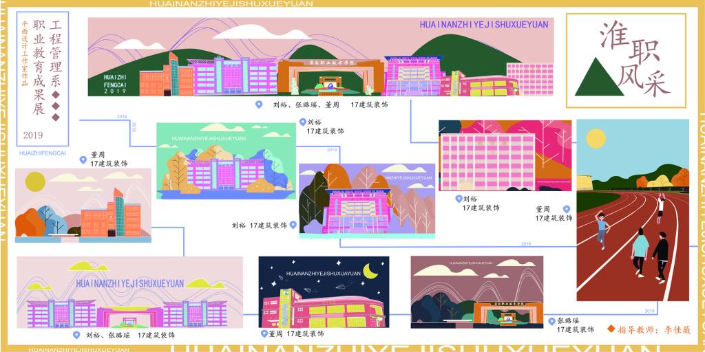 本次展出的是我校建筑装饰专业学生作品。作品展从大量的学生作品中精选68幅作品,总计六个版面,分为四个版块展出:装饰工作室教学成果、平面工作室教学成果、校外教学实践活动教学成果以及校内学生动手能力培养成果。其中,校外教学实践活动和装饰工作室学生呈现的都是实体项目,从量房、CAD草图到室内效果图一气呵成;平面工作室学生作品“忆淮南”,以龙湖印象为基点,展示了淮南市的标志性建筑;作品“淮职风采”,展示了教学楼、图书馆、运动场等同学们的熟悉场所,表达了学生对学校的热爱。所有作品于4月15日汇总到平面工作室,由平面工作室师生设计、排版。平面工作室负责老师表示,本次活动同学们前前后后准备了一两个月,每一个作品都是大家精心设计的,在这个过程中,同学们学到了很多东西。