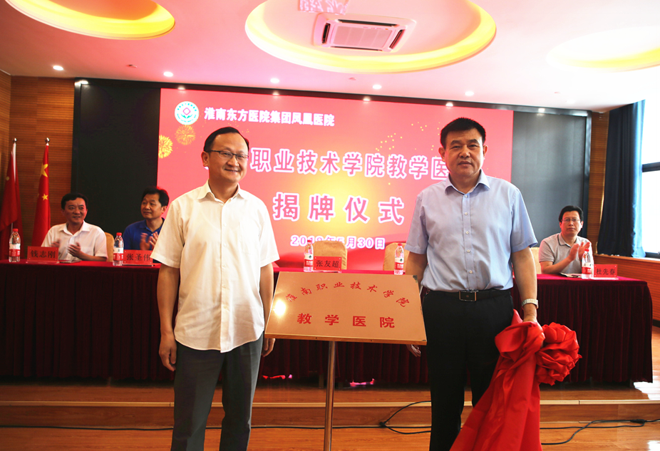 张友超副书记与刘春生院长共同为淮南职业技术学院教学医院揭牌。