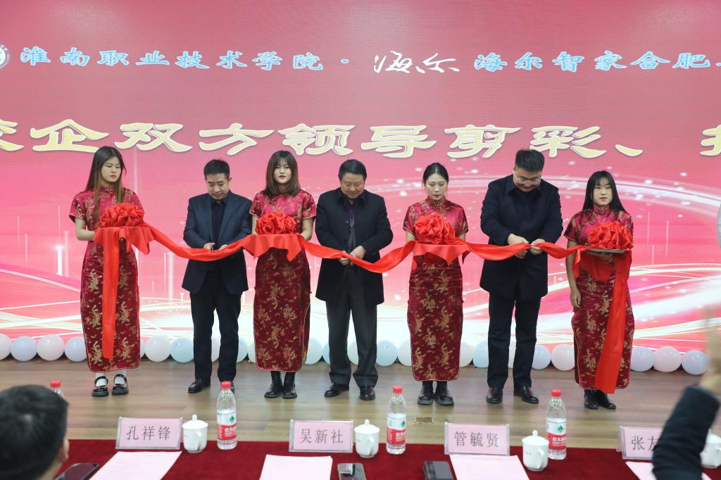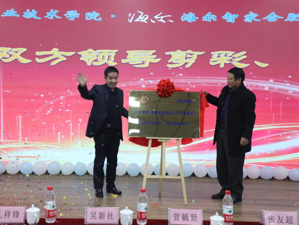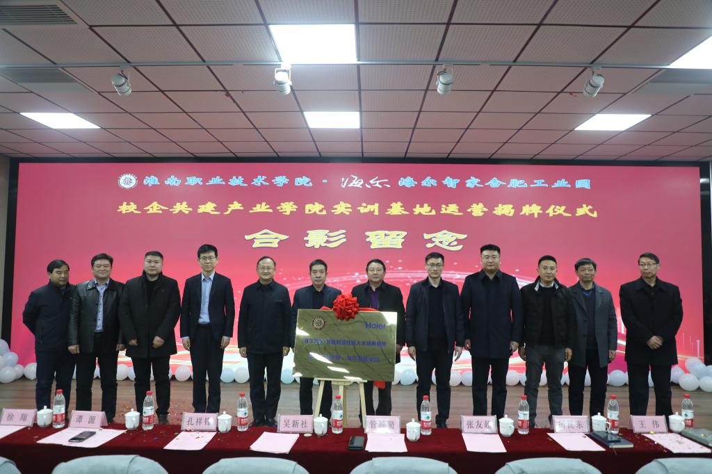 1月4日,淮南职业技术学院与合肥海尔工业园合作共建的海尔智能学院实训基地运营揭牌仪式在1111报告厅隆重举行。学校党委书记、校长吴新社,海尔合肥电冰箱有限公司总经理管毓贤出席仪式并致辞;合肥商用空调总经理孔祥锋、合肥滚筒洗衣机总经理谭源、华东园区人力总监柯艮东、合肥波轮洗衣机副总经理徐翔、合肥家用空调副总经理王伟,学校党委副书记、纪委书记、工会主席张友超,副校长朱云辉、凌总成、王德恩、胡道成出席了揭牌仪式;教务处、机电工程学院、智能与电气工程学院等部门和单位的负责人、教师代表、学生代表,共计260多人参加了揭牌仪式。仪式由副校长胡道成主持。
