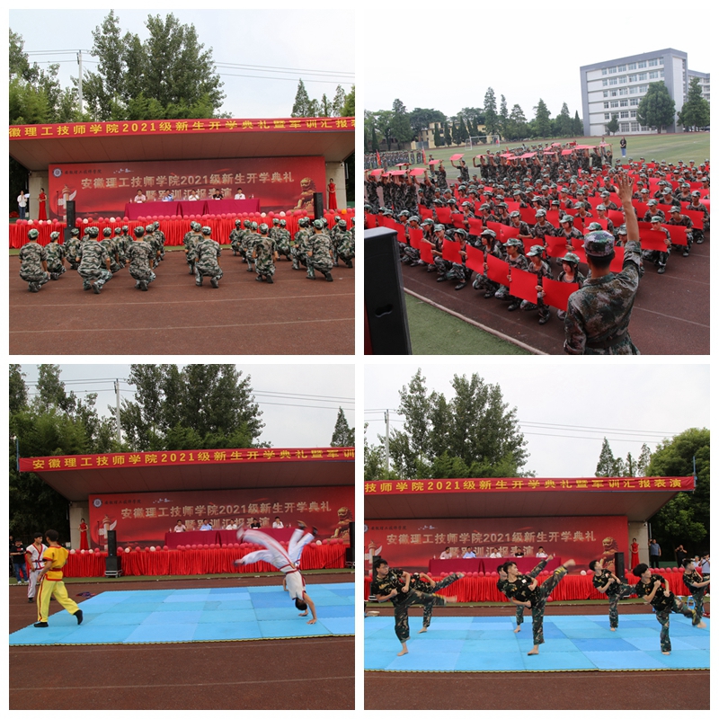 在雄壮、嘹亮的国歌声中,开学典礼暨军训汇报表演拉开了序幕。第一个出场的是“红心向党”数字方阵队,方阵依次摆出“100”、“72”、“70”三个数字,代表伟大的中国共产党成立100周年,伟大的中华人民共和国成立72周年,淮南职业技术学院暨安徽理工技师学院成立70周年,表达了同学们“请党放心,强国有我”的壮志豪情。第二个出场的是“手语操”方阵队,同学们用优美的舞姿,娴熟的手语演绎了一曲真挚动人的手语歌《听我说谢谢你》,表达了同学们的感恩之心。第三个出场的是队列方阵,他们以饱满的热情、充沛的活力、迅速的反应向大家充分展示了军训一周以来的训练成果和朝气蓬勃的精神风貌,赢得了在场师生的热烈掌声。“擒敌拳”、“中国式摔跤”和“军事化跆拳道搏击”表演中一个个高难度动作,恢宏的气势,赢得了一片欢呼和惊叹声。