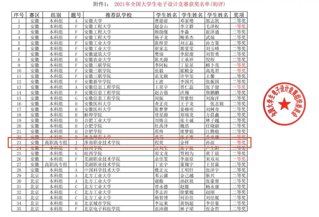 近日,全国大学生电子设计竞赛组织委员会发布了《关于公布2021年全国大学生电子设计竞赛获奖名单的通知》,我校程奕、金祥、孙波三位同学组成的参赛队喜获全国一等奖,是安徽省2021年参加该赛项唯一一所获全国一等奖的高职院校。