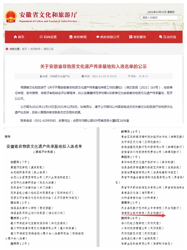 近日,安徽省文化和旅游厅发布了《关于安徽省非物质文化遗产传承基地拟入选名单的公示》,淮南职业技术学院(凤台花鼓灯)进入拟入选名单并被拟定为安徽省非物质文化遗产传承基地,充分表明了我校传承花鼓灯艺术获得了社会的认可,体现了我校花鼓灯传承模式在省内非遗传承方面示范作用,同时也肯定了我校多年来为传承弘扬花鼓灯优秀传统文化所做出的重要贡献。(撰稿、审稿 王新亮 发布:戴文涛)