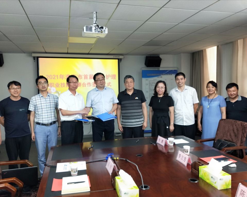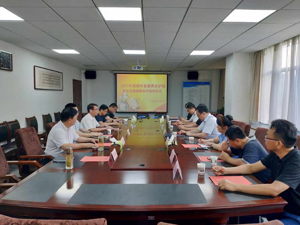 为贯彻落实2021年淮南市养老护理职业技能竞赛暨全国养老护理员职业技能大赛淮南市赛区选拔赛文件精神,确保大赛各项活动顺利实施,7月1日下午,我校与淮南市养老行业协会在行政办公楼三楼会议室举行签约仪式。淮南市民政局副局长黄元胜、淮南市民政局养老服务科科长陈善民、淮南市养老行业协会会长王龙等出席签约仪式,签约仪式由淮南职业技术学院副校长王德恩主持。