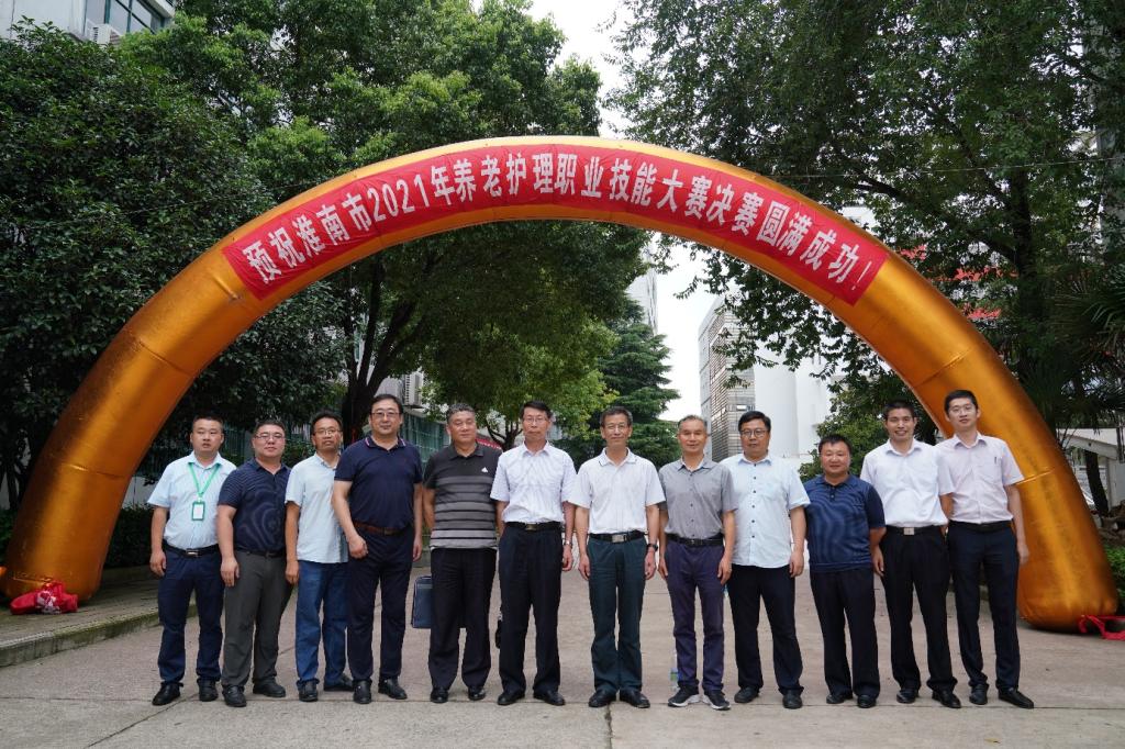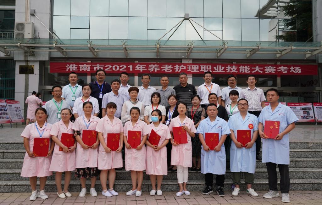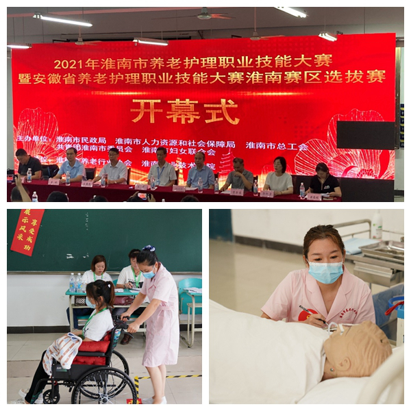 2021年7月29日上午8时,惠风和畅,为响应“十四五”积极应对人口老龄化工程和托育建设实施方案,加快推进淮南市养老服务体系建设,发挥高职高专在培养国家紧缺人才上的重要作用,由淮南市民政局、淮南市人力资源和社会保障局、淮南市总工会、淮南团市委、淮南市妇联共同举办,淮南职业技术学院和淮南市养老协会共同承办的首届淮南市养老护理职业技能大赛暨安徽省养老护理职业技能大赛淮南赛区选拔赛在我校正式举行。此次竞赛有10支代表队共30人参赛,同时选聘我校医学院教师担任此次大赛的评委,保证大赛的顺利进行。