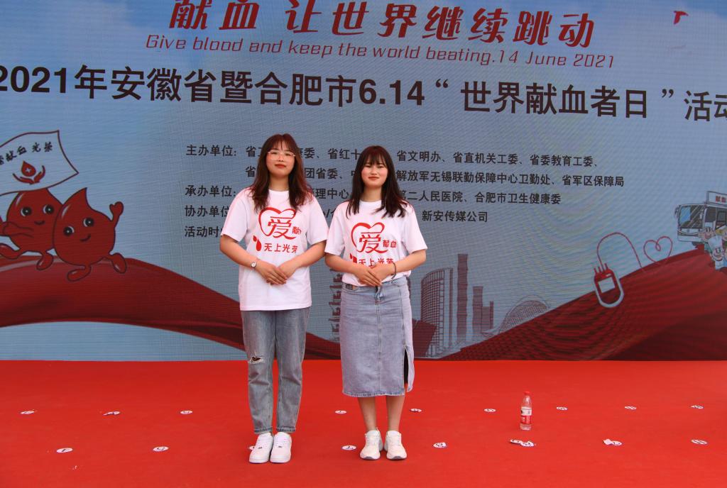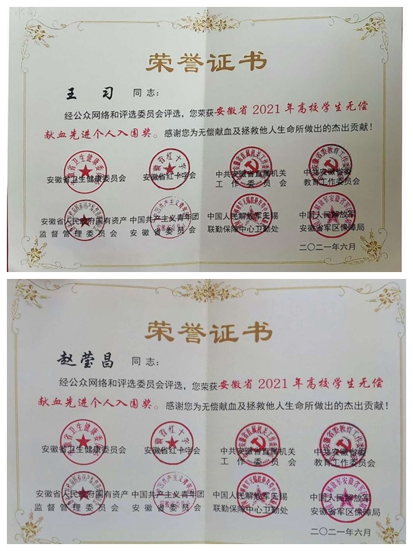 近日,由省卫健委、省红十字会、省文明办等部门共同主办的2021年安徽省无偿献血公益之星和先进集体评选表彰大会在合肥举行。校学生会志愿服务中心负责人王习、赵莹昌同学参加大会并荣获“安徽省2021年高校学生无偿献血先进个人入围奖”。