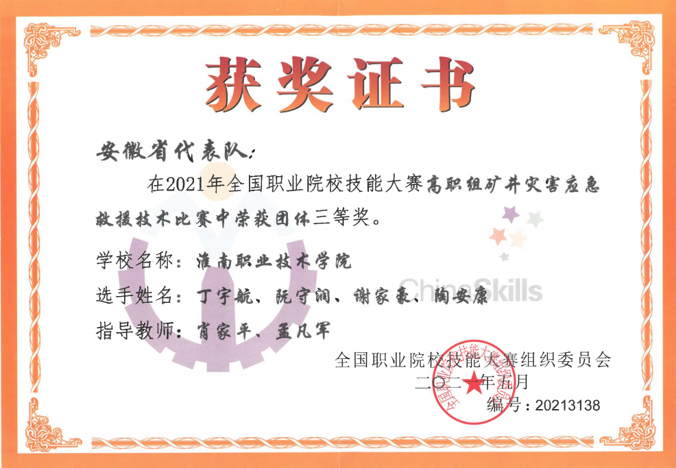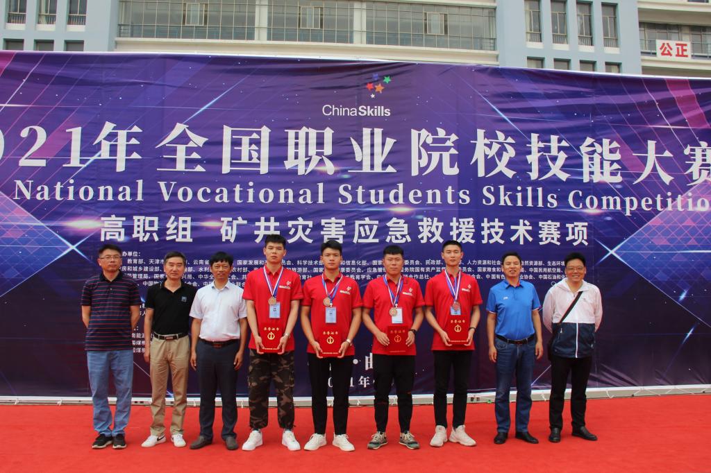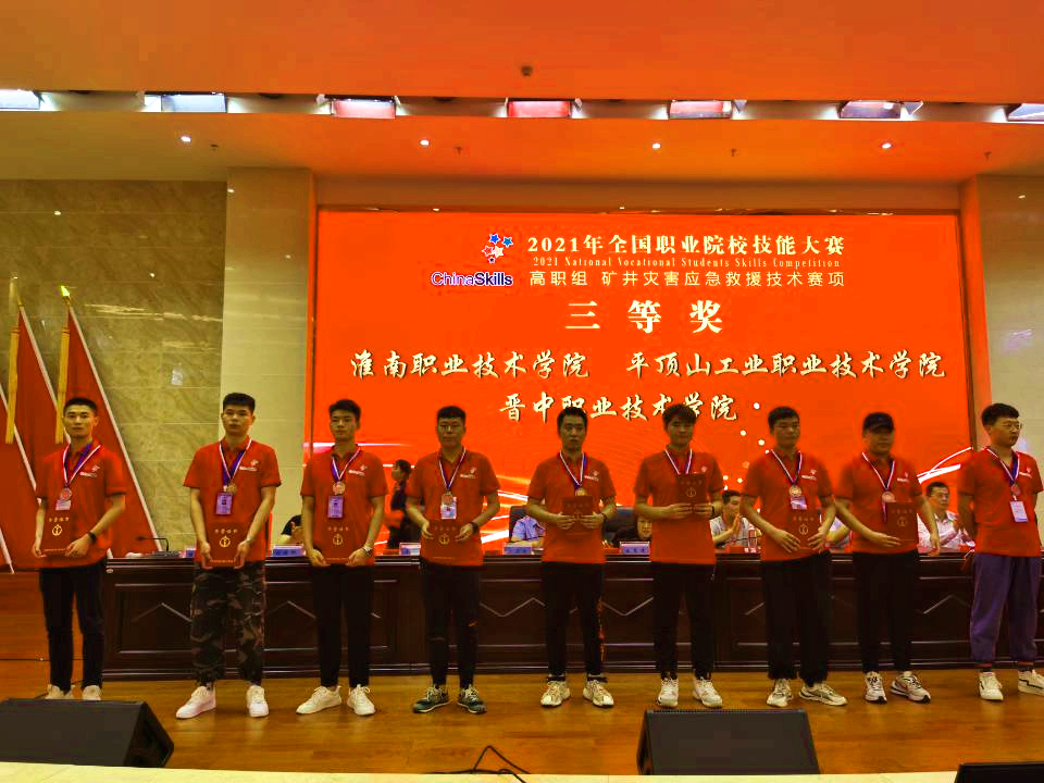 来自全国各省(市)、自治区的21支代表队的84名选手参加现场角逐。各参赛队在赛场上比拼技能、展示风采、增进友谊,彰显了新时代职业技术人才的精神风貌。经过激烈的角逐,由我院丁宇航、阮守润、谢家豪、陶安康四名学子组成的安徽省代表队,勇夺2021年全国职业院校技能大赛高职组“矿井灾害应急救援技术”赛项团体三等奖,综合排名列全国第七。(撰稿:肖家平 摄影:朱珠、周波 审核:孙泽宏 发布:戴文涛)